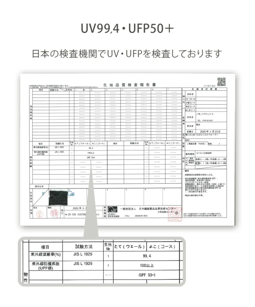 UVカット率 99.4%・UPF値 50+ の紫外線防御機能を備えています。